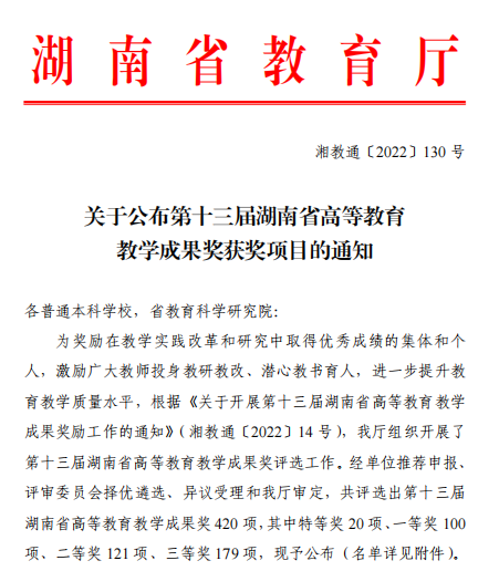 近日,湖南省教育厅公布了第十三届湖南省高等教育教学成果奖评审结果,yL23411永利集团官网登录喜获教学成果奖一等奖两项,实现了历年获奖新的突破。体现出社会对yL23411永利集团官网登录在办学定位、办学质量、办学特色等方面的广泛认同。