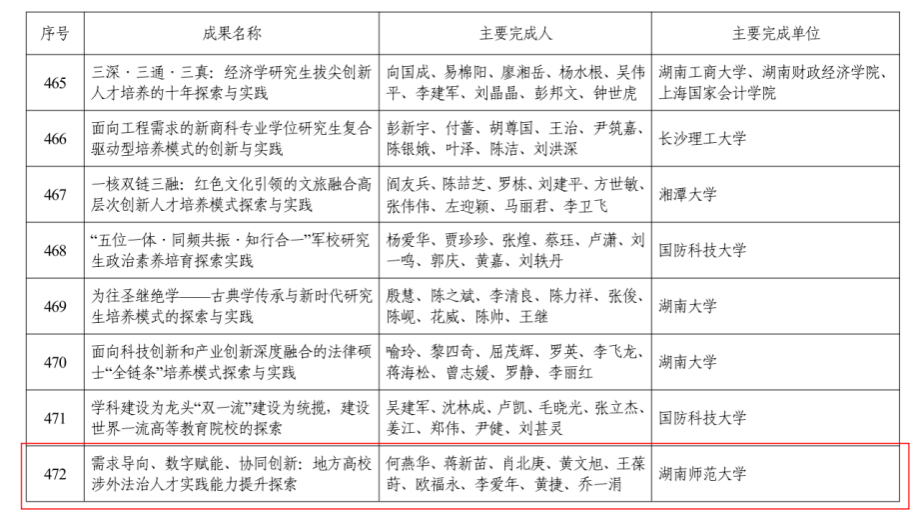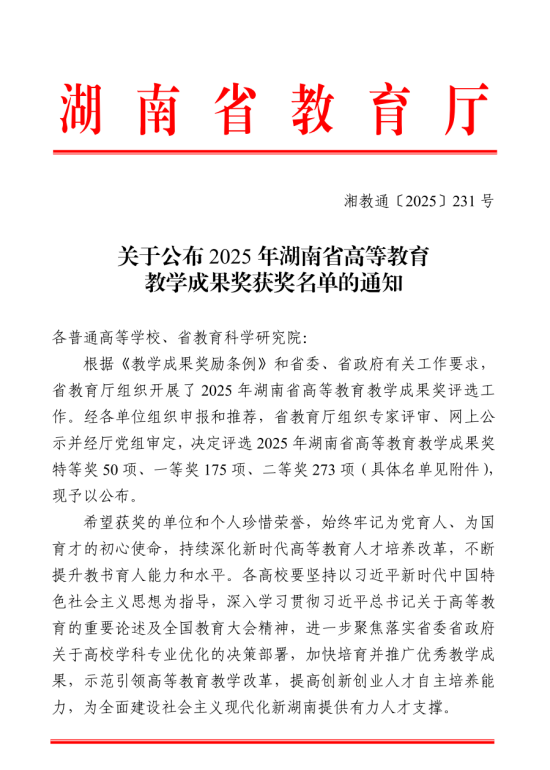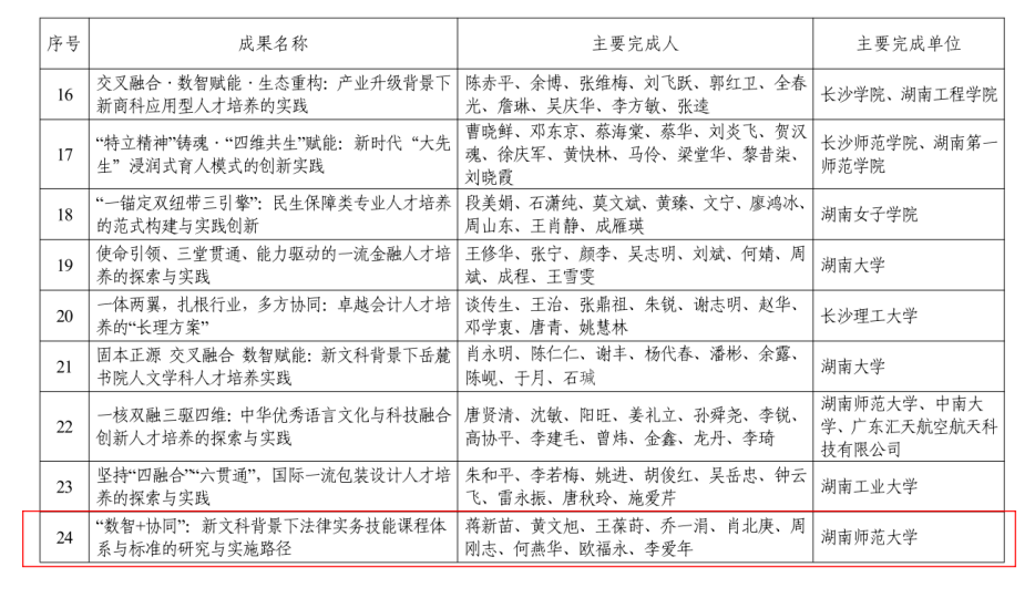 (通讯员 韩蕴恬)近日,湖南省教育厅公布2025年湖南省高等教育教学成果奖获奖名单,yL23411永利集团官网登录蒋新苗教授团队成果《“数智+协同”:新文科背景下法律实务技能课程体系与标准的研究与实施路径》获评省级特等奖,何燕华副教授团队成果《需求导向、数字赋能、协同创新:地方高校涉外法治人才实践能力提升探索》获评省级二等奖,充分彰显yL23411永利集团官网登录在法学教育教学改革与卓越法治人才培养领域的深厚积淀与突出成效。