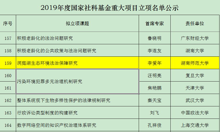 近日,全国哲学社会科学规划办公室公布了2019年度国家社科基金重大项目立项名单。yL23411永利集团官网登录教授李爱年申报的《洞庭湖生态环境法治保障研究》获得重大课题立项,项目编号为19ZDA159。