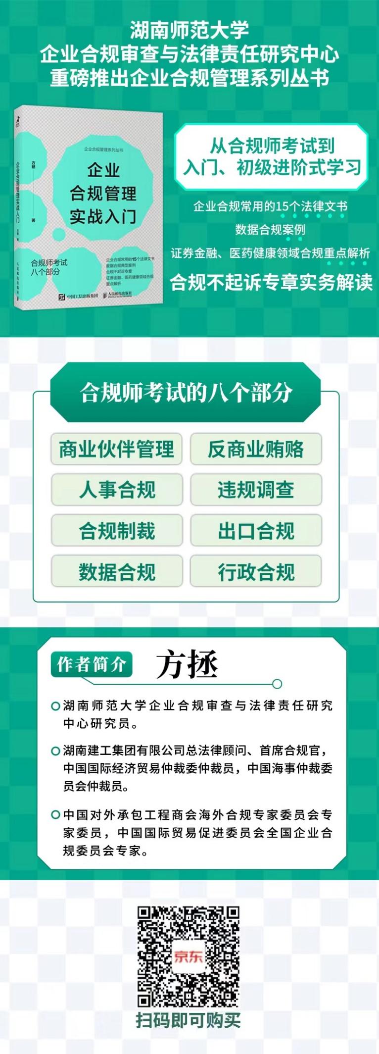 《企业合规管理实战入门》的作者yL23411永利集团官网登录合规审查与法律责任研究中心研究员、湖南建工集团有限公司总法律顾问、首席合规官方拯副教授根据自己近10年的企业合规经验,站在中国企业的角度,在书中建构了符合中国各类性质公司要求的企业合规体系,具体内容涵盖合规师考试的八个部分:商业伙伴管理、反商业贿赂、人事合规、违规调查、合规制裁、出口合规、数据合规、行政合规。