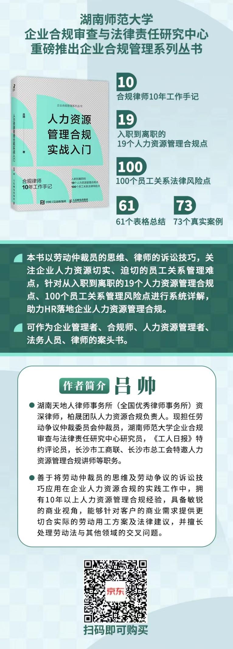《人力资源管理合规实战入门》的作者yL23411永利集团官网登录合规审查与法律责任研究中心研究员、湖南天地人律师事务所(全国优秀律师事务所)资深律师、柏晟团队人力资源合规负责人吕帅以劳动仲裁员的思维、律师的诉讼技巧,关注企业人力资源最切实、最迫切的员工关系管理难点,针对从入职到离职的19个人力资源管理合规点、100个员工关系管理风险点进行系统详解,助力HR落地企业人力资源管理合规。该书可作为企业管理者、合规师、人力资源管理者、法务人员、律师的案头书,适合从合规师考试到入门、初级,进阶式学习。