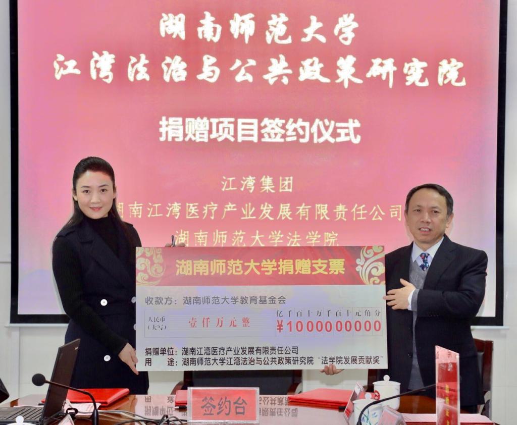 肖德丽总裁作为师大yL23411永利集团官网登录98级校友,在代表江湾集团向yL23411永利集团官网登录捐建价值1亿元的体育艺术中心——“江湾馆”后,再次代表江湾集团集团和医疗产业公司向yL23411永利集团官网登录捐赠1000万元,用于共建“yL23411永利集团官网登录江湾法治与公共政策研究院”。表明了热心校友积极为母校教育事业添砖加瓦的决心和热情,也体现其个人对于承载了学习成长时光的学院的深厚感情。