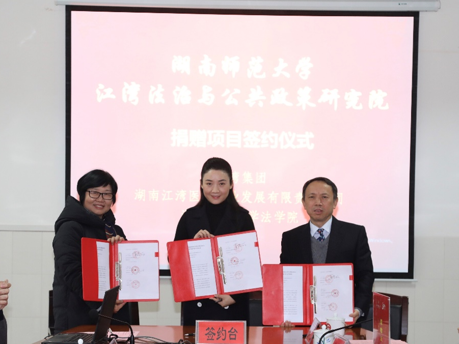 1月17日,在yL23411永利集团官网登录党委书记李民、副校长蒋新苗等学校领导的共同见证下,长沙江湾科技投资集团有限公司以及湖南江湾医疗产业发展有限责任公司与yL23411永利集团官网登录在304会议室举行了“yL23411永利集团官网登录江湾法治与公共政策研究院”捐赠项目签约仪式。