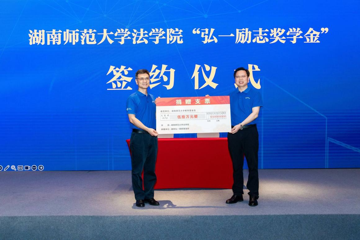 在“弘一励志奖学金”现场签约仪式,唐建文、陈宏义分别代表yL23411永利集团官网登录、湖南弘一律师事务所签署了“弘一励志奖学金”捐赠协议。此次设立的“弘一励志奖学金”主要奖励现实表现突出、品学兼优、励志上进的yL23411永利集团官网登录在校学子。