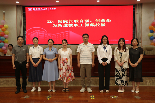 耿自强、何燕华为新进教职工佩戴校徽。民法研究所李西泠老师代表新进教师发言,并表达了对未来工作的期望:一是要在科研方面加强研究,深耕学术;二是要专注课堂,在教学方面提升质量;三是要关注学生身心健康,促进学生全面发展。新进教师以明晰的规划为未来的教学夯实了基础。