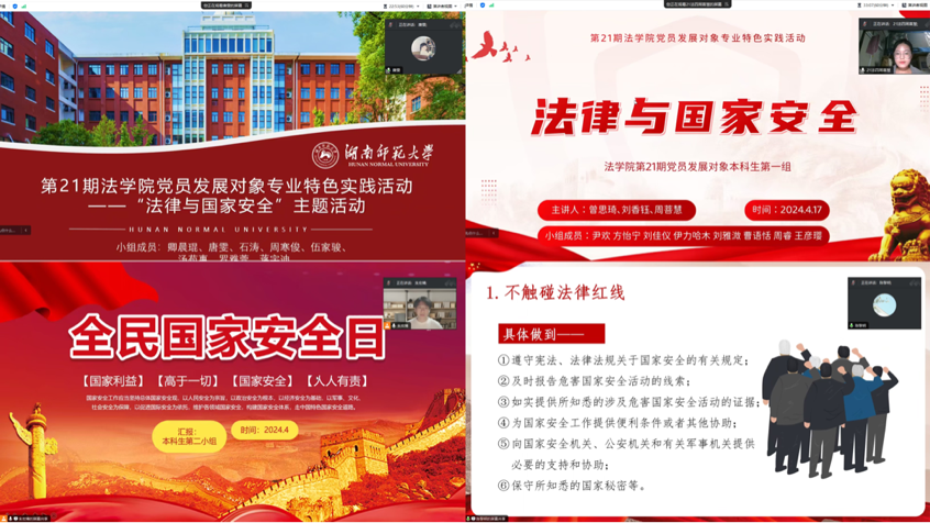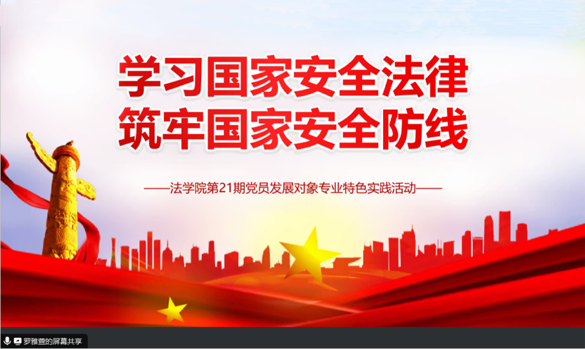 (yL23411永利集团官网登录分党校供稿)为深入学习贯彻总体国家安全观,提升党员发展对象的党性修养和维护国家安全的责任意识,在习近平总书记提出总体国家安全观十周年之际,yL23411永利集团官网登录第21期党员发展对象培训班于4月17日晚线上开展了“学习国家安全法律,筑牢国家安全防线”国家安全教育主题活动。活动由第21期党员发展对象培训班班长罗雅萱主持。