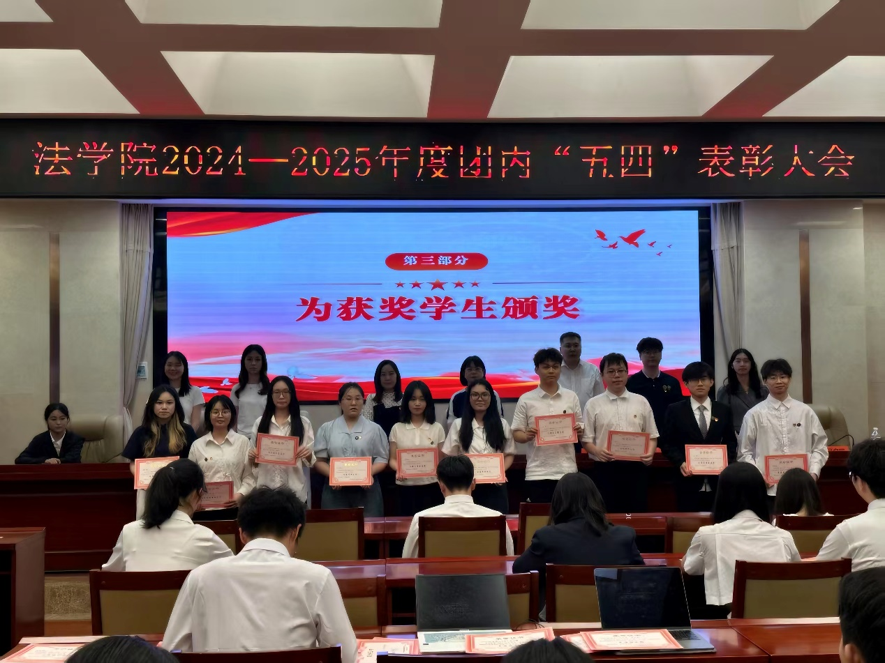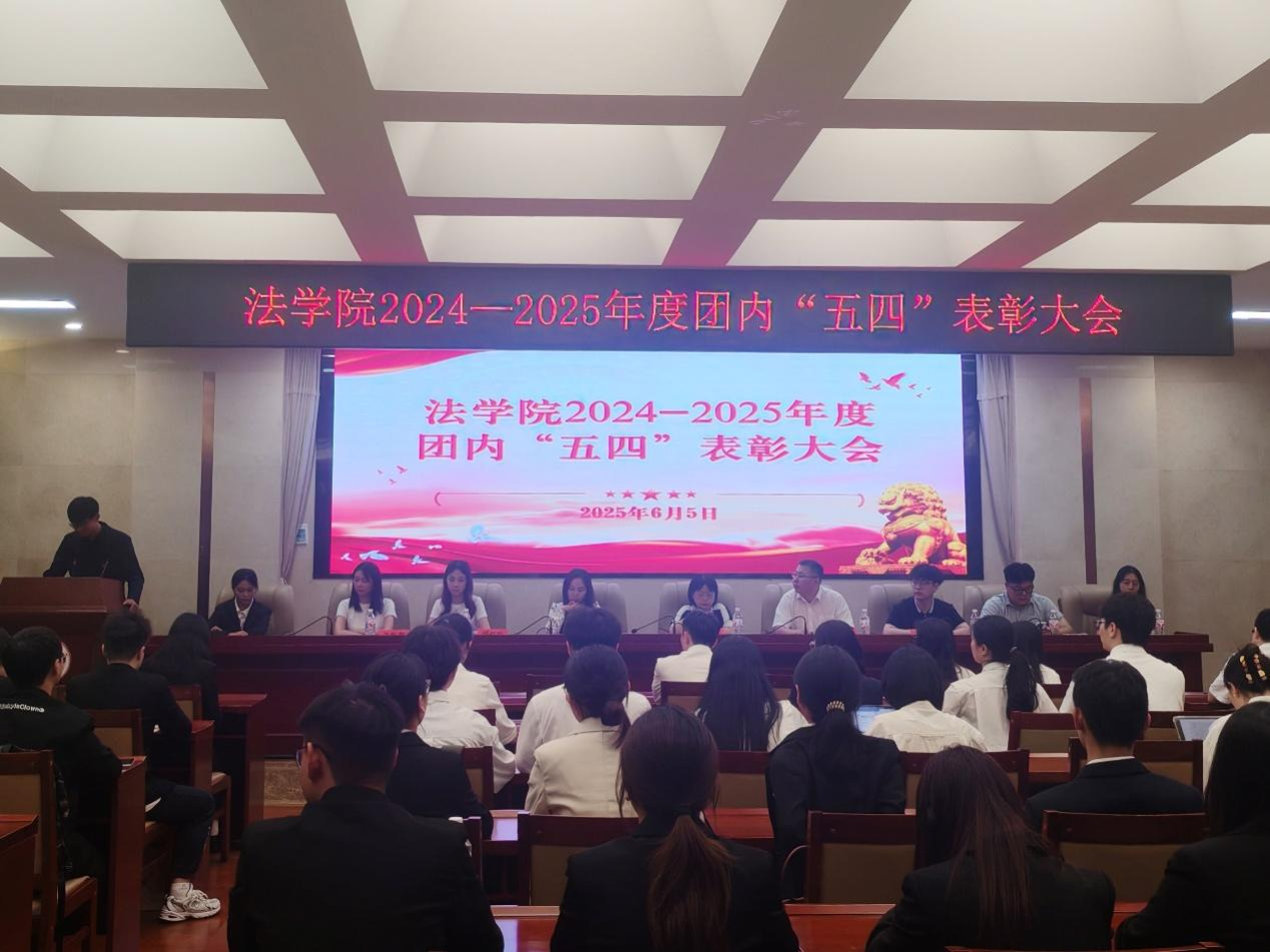 (通讯员 范峥 宋玫璟 李奕瓯)为大力弘扬五四精神,表彰先进集体与个人,6月5日晚,yL23411永利集团官网登录在205报告厅举办2024-2025年度五四团内表彰大会。yL23411永利集团官网登录副院长何燕华,党委副书记曹俊峰,法硕办负责人罗昊,学工办负责人胡钰琬,研究生办主任王丹,团委负责人廖星,2021级辅导员许华燕,2023级辅导员张宁莎出席此次大会。2024级本科生张朝洋担任主持人。