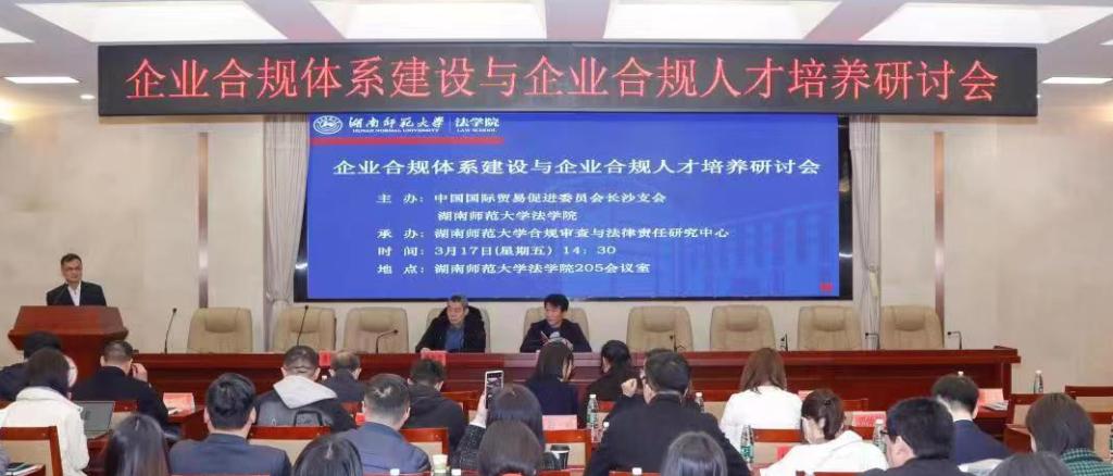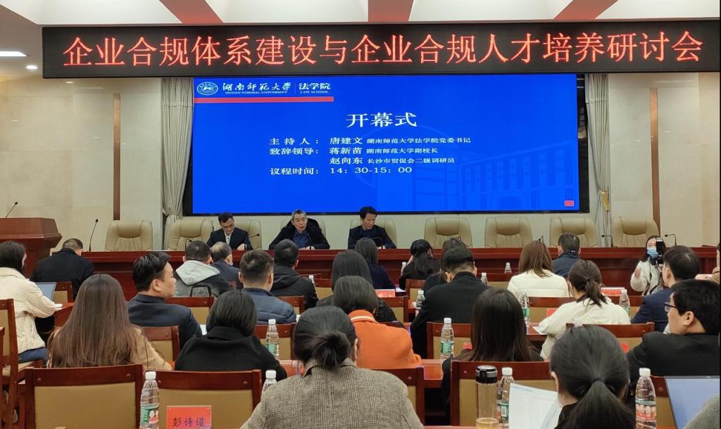 (通讯员 许志娟 王湘莹 罗雅萱)3月17日下午,企业合规体系建设与企业合规人才培养研讨会在yL23411永利集团官网登录205报告厅成功举行。我校副校长蒋新苗、中国国际贸易促进委员会长沙支会二级调研员赵向东、湖南省人民检察院李春阳、长沙市人民检察院李琼、岳麓区人民检察院肖彬、省国资委政策研究与法规处陈宁、国家电网湖南电力有限公司吴德松、湖南建工集团有限公司方拯、国浩律师(长沙)事务所夏祎彤、湖南金州律师事务所文颖、湖南天地人律师事务所吕帅、yL23411永利集团官网登录党委书记唐建文、院长肖北庚、副院长欧福永等领导和专家出席此次研讨会。